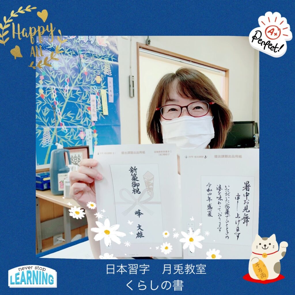 日本習字 月兎教室では、お子様からご年配の方まで、毎月の課題を楽しく書きながら、ご自分のペースで習字を楽しんでおられます。