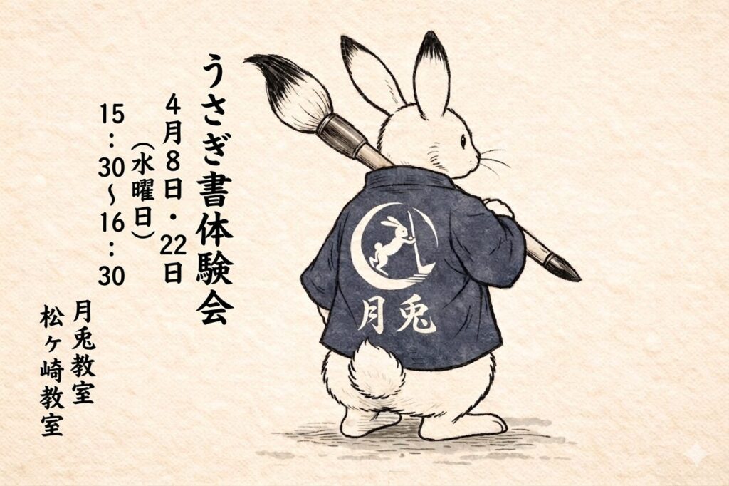 松阪市松ヶ崎の月兎書道教室で4月8日と22日に体験レッスン開催。なぞって描けるうさぎの書道体験で、はじめてでも安心して楽しめます。子どもも大人も参加できます。